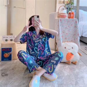 Beautiful Nightwear In Half Sleeve Button Down Collar Top With Full Length Elastic Pajamas