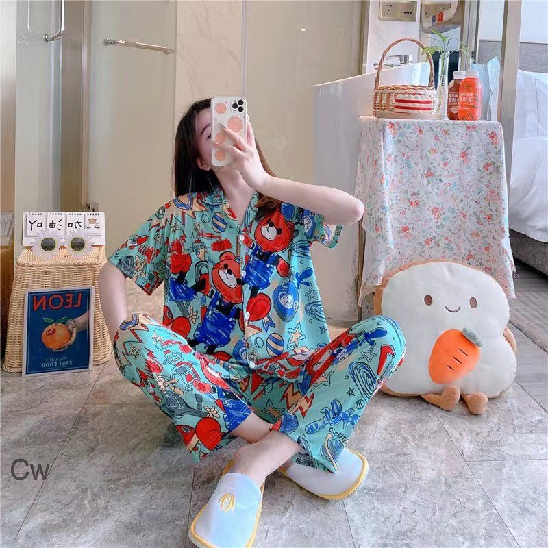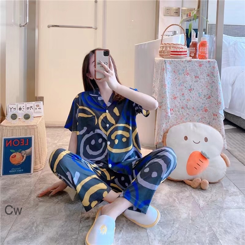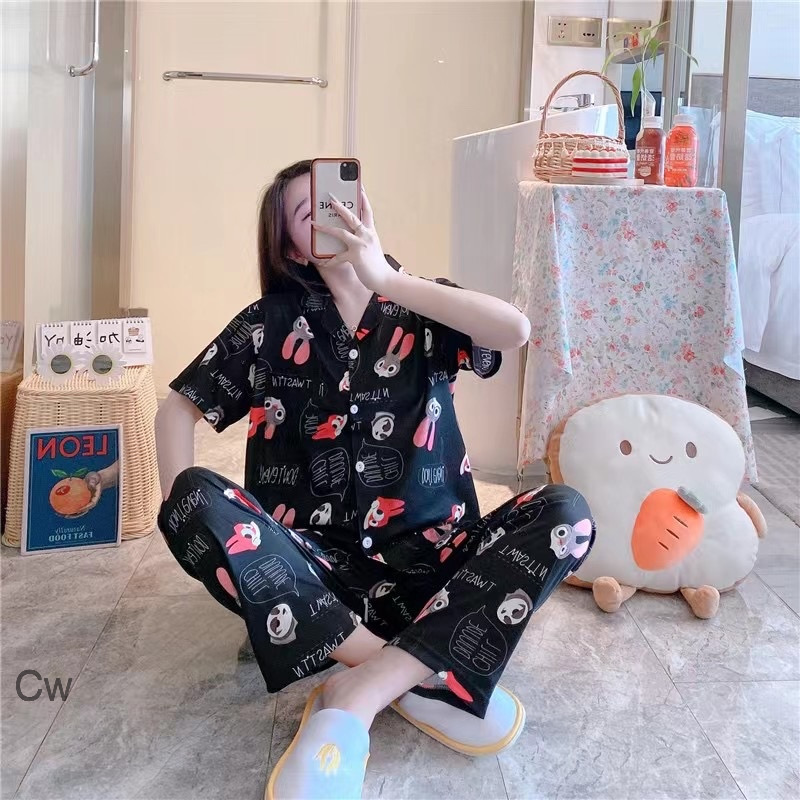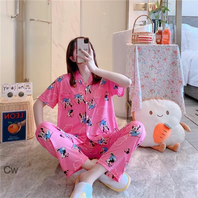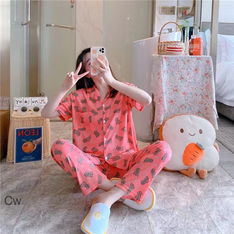 Beautiful Nightwear In Half Sleeve Button Down Collar Top With Full Length Elastic PajamasÂ