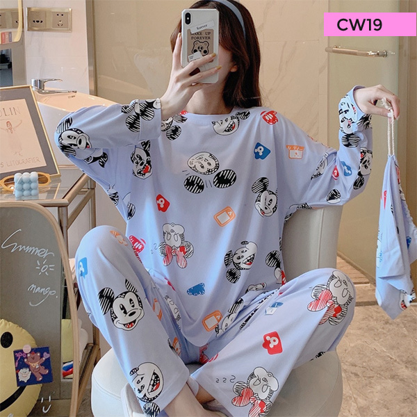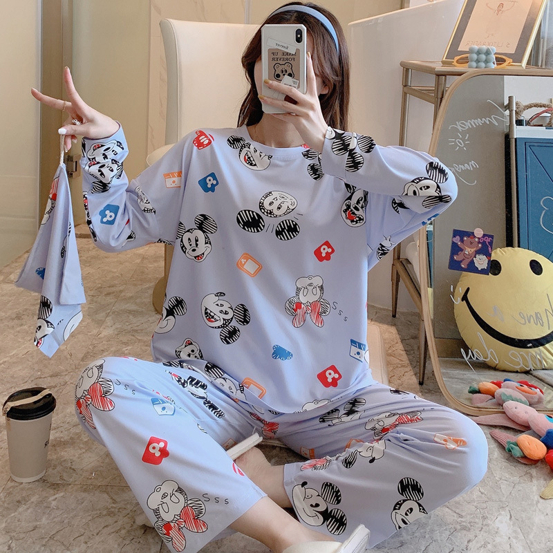 Beautiful Mickey & Minnie Full Sleeve Round Neck Blue Top With Full Length Blue Elastic Pajamas Free Bag