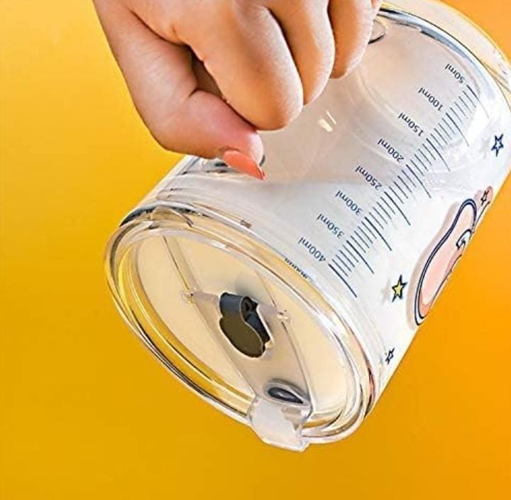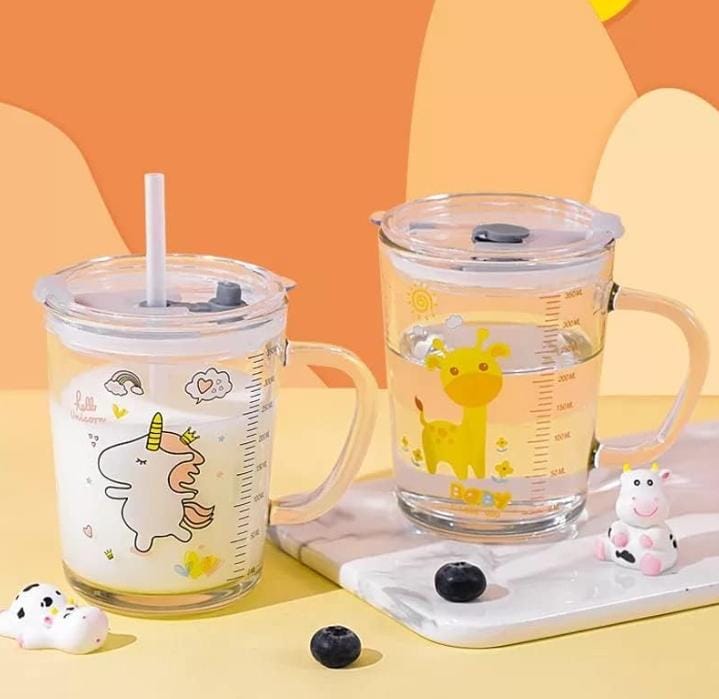 Glass Tumbler Milk Cup With Silicone Straw And Lid Handle For Kids & Adult Heavy Glass Cup 350ml Water Mug With Scale Juice And Drinking Mug For Kids.