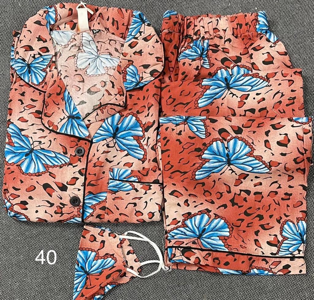 Beautiful Full Sleeve Button Down Collar Top With Full Length Elastic Pajamas With Mask