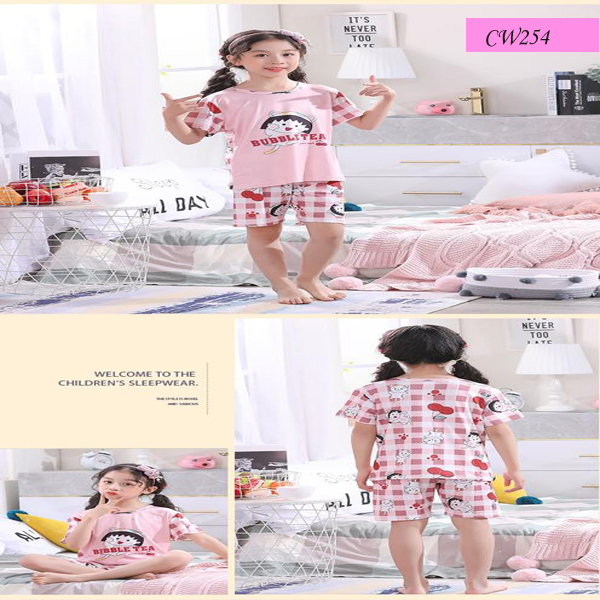 Kids Cartoon Nightwear Half Sleeve Round Neck Pink Top With Elastic ShortsÂ