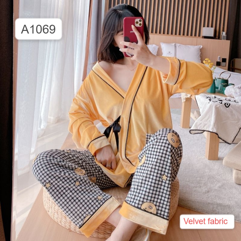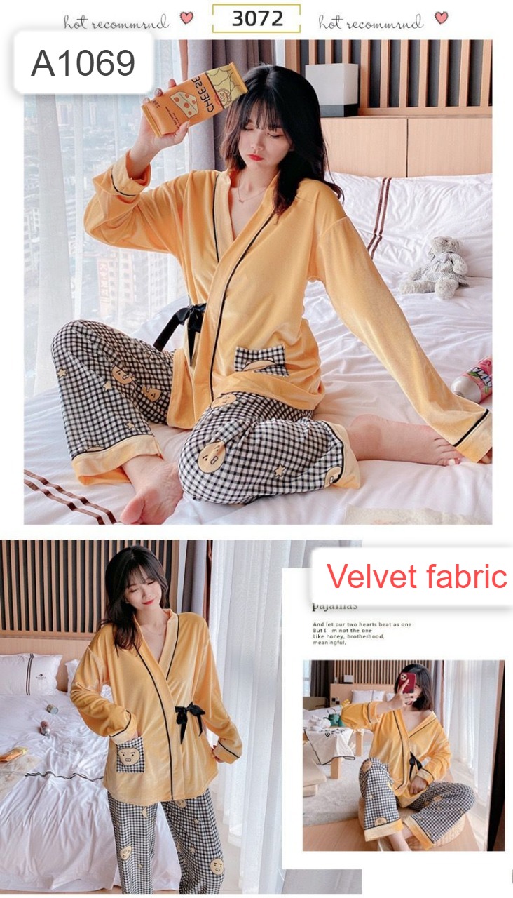 Velvet 2 Pcs Set In Full Sleeves Top With Side Knots In Elastic Pajama
