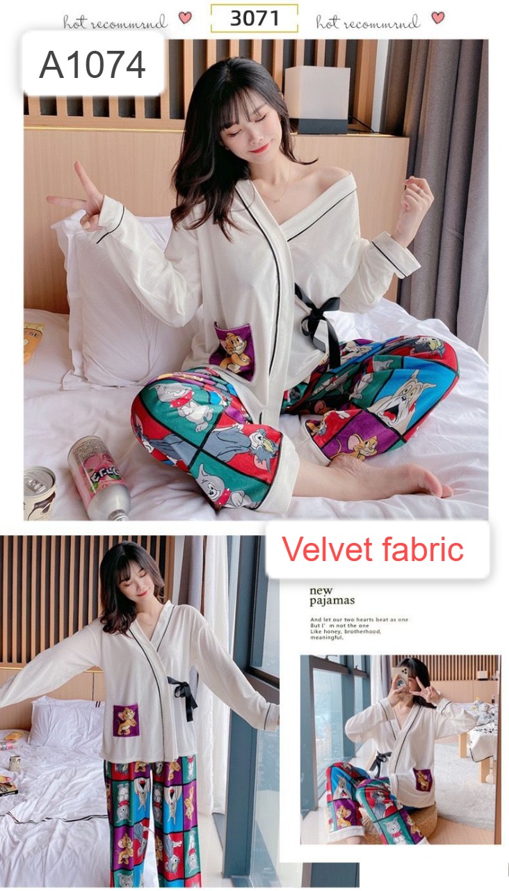 Velvet 2 Pcs Set In Full Sleeves Top With Side Knots In Elastic Pajama